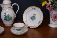 Watteau painting with romantic depictions on each piece, as well as golden flower reliefs & gold rim