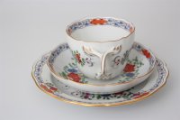 Sehr schönes Mokka Service mit Indische Blumenmalerei mit bunte Kupferfarben Goldrand. Es gibt viele verschiedene einzelne Farben für Indsche Blumenmalerei und dieses schöne Service ist mit seltene bunt bemalt.